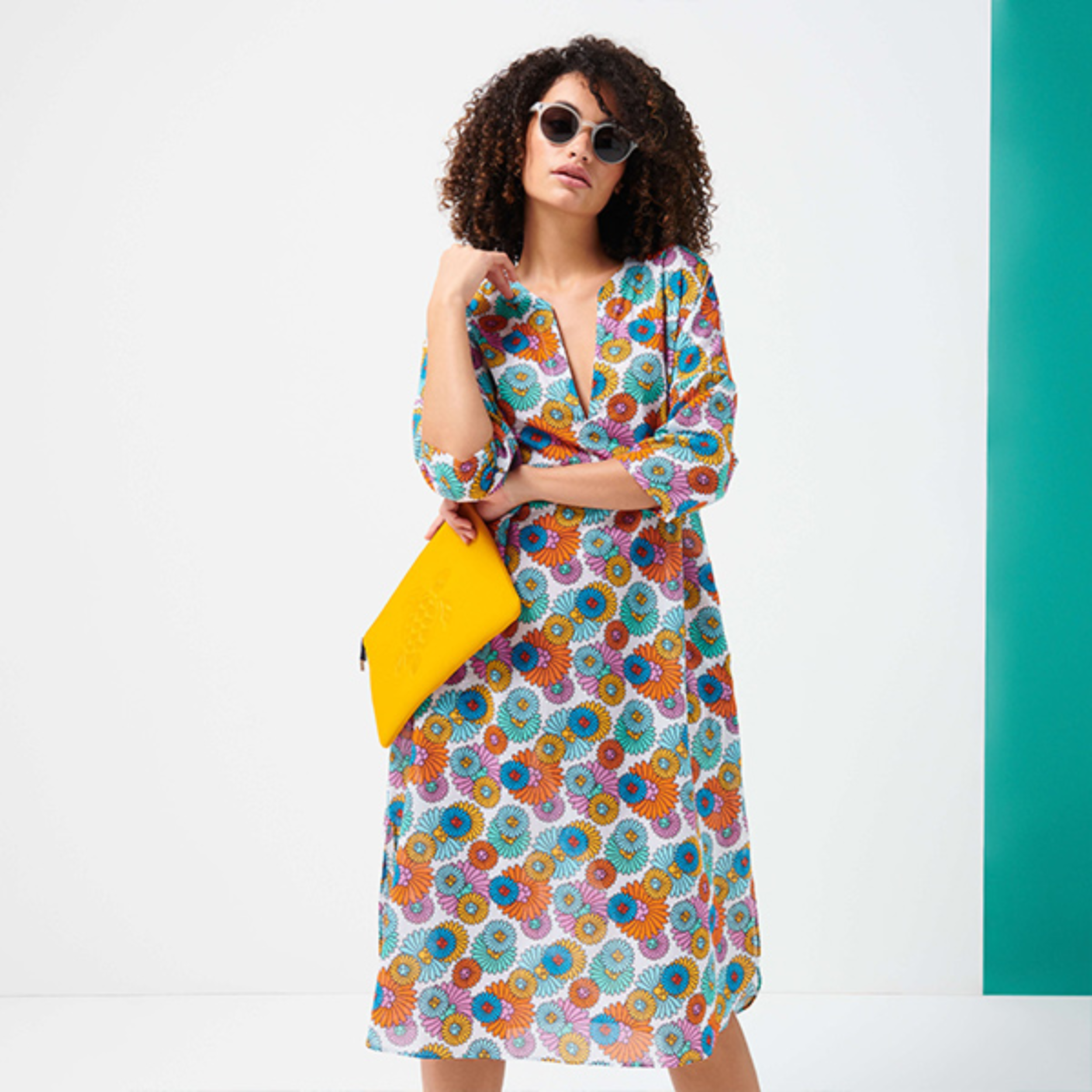 BuMarguerite kadın pamuklu plaj tuniğindeki pop art baskı ile çiçekler arasında rahatlayın. Dinlenmek için mükemmel bir tercih olan bu uzun salaş elbise 3/4 kollu, iki cepli ve yanlarında yırtmaç detaylı.